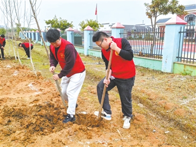 近日,湖口县付垅乡开展义务植树活动,推进人居环境改善。活动中,乡机关干部热情高涨,相互配合,干劲十足,搬运树苗、扶苗、培土、压实等环节一气呵成。刚种下的树苗在春风中摇曳生姿,为美丽乡村再添一份新绿。(郭楚君 摄)