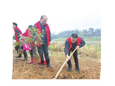 3月7日,彭泽县太平关乡新时代文明实践所联合乡团委开展志愿服务活动。志愿者们挥锹挖土、扶树正苗、培土压实,一株株新栽下的冬青苗在春风中昂然挺立,孕育着满目生机。(金小洁 摄)