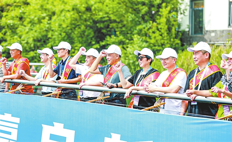 微风轻轻拂过,吹起劳模们的衣角。他们站在玻璃栈道上,见证着龙舟赛的激情与活力,也传递着拼搏与奋斗的精神力量。