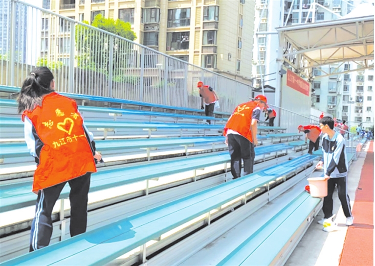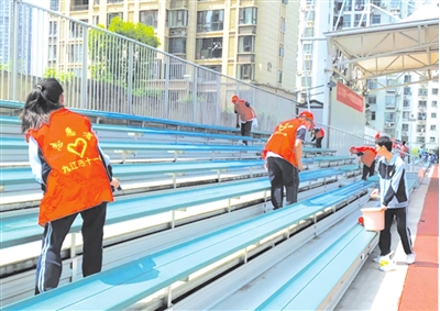 在老师的带领下,志愿者或躬身擦拭看台坐凳缝隙的积尘,或蹲身清理跑道边的碎石;将操场看台划分为13个责任区,对坐凳的背面、转角等卫生死角进行清理。(黄恬恬 摄)