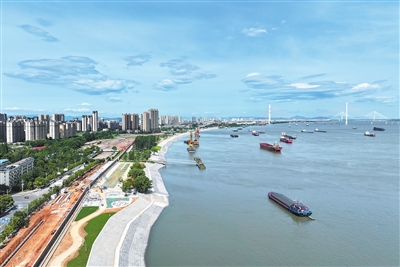 6月18日,长江国家文化公园(九江城区段)三期项目建设现场,一处处休闲广场、一座座运动球场雏形初现,工人们分布在各个节点,紧张有序地进行施工。三期工程总长度约6.5公里,由滨江段、老火车站历史风貌区提升改造、老客运港风貌区提升改造三个子项目组成,目前建设主要集中在滨江段,该段按照“一带三区八大节点”进行规划设计,施工内容包含贯通滨江西路、拓宽堤顶道路、治理堤外滩地、打造景观节点、完善沿线配套设施等。(本报记者 刘 家 摄)