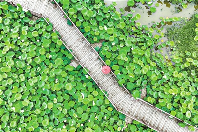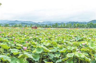 6月15日,武宁县澧溪镇七彩长乐景区内的千亩荷花次第开放,青山环绕下的浩瀚花海十分壮观。微风吹拂,清芬可人的荷香便四处弥散。该景区结合现有千亩莲田、森林公园等优势资源,围绕澧溪镇休闲旅游总体思路,打造集莲子产业、住宿、餐饮、荷塘旅拍、休闲垂钓、农业观光、研学体验等于一体的多功能综合型乡村微度假区。(本报记者 刘 家 摄) |
