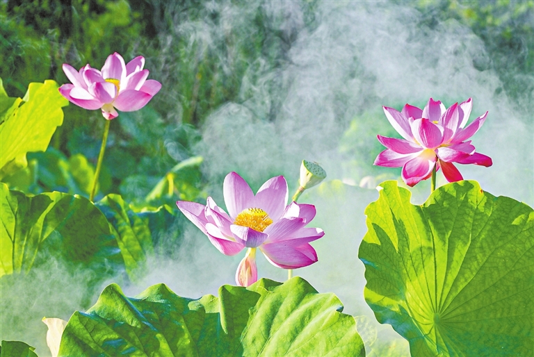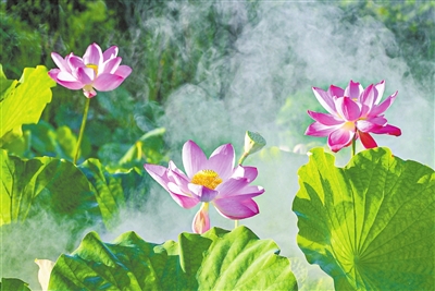 浓雾是夏天的主角,它们的出现会在短暂时间内影响空气质量和人们的出行,但很快就会是晴朗的天气。浓雾隐退之后,阳光透过云层照着大地,云缝中投射出一根根硕大的光柱;团云消失之后,蓝宝石一样的天空上只剩下一块滚圆的古铜,光芒四射格外耀眼。天色的蓝和阳光的光都明显较之春天程度不同。大地之上所有需要阳光热能的物体,也都会与之发生互动以产生光合作用。那应该是夏季特有的物理反应,应该是夏季旺盛生命力的所在。人们顶着蓝天踩着绿地,在天地之间创造着属于自己的天地。这一爿天地虽然渺小,却跟宇宙达成了一种神奇的默契。