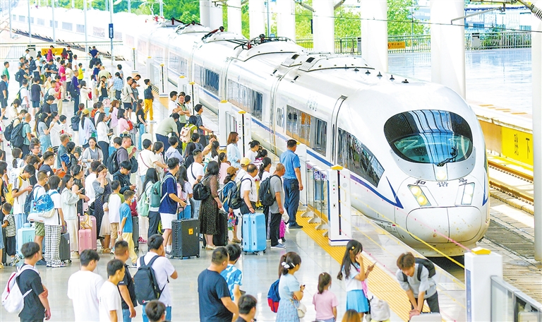 当日,全国铁路实行新的列车运行图,同时为期62天的2025年全国铁路暑期运输也拉开帷幕。(新华社发 张怡熙 摄)