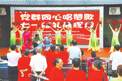 6月27日,浔阳区人民路街道湖滨社区举行“党群同心唱赞歌,‘七一’献礼展辉煌”文艺汇演。居民们在新时代文明实践广场载歌载舞,18个节目声情并茂,抒发对党的无限忠诚与热爱。(杨 青 摄)