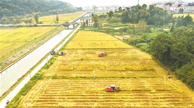 日前,瑞昌市南阳乡双桥村,农机手驾驶收割机忙着收割水稻。据悉,瑞昌市各农业合作社正抢抓晴好天气,积极组织收割机械和运输车辆,对成熟的水稻适时抢收,确保颗粒归仓。(何玥靓 本报记者 张 驰 摄)