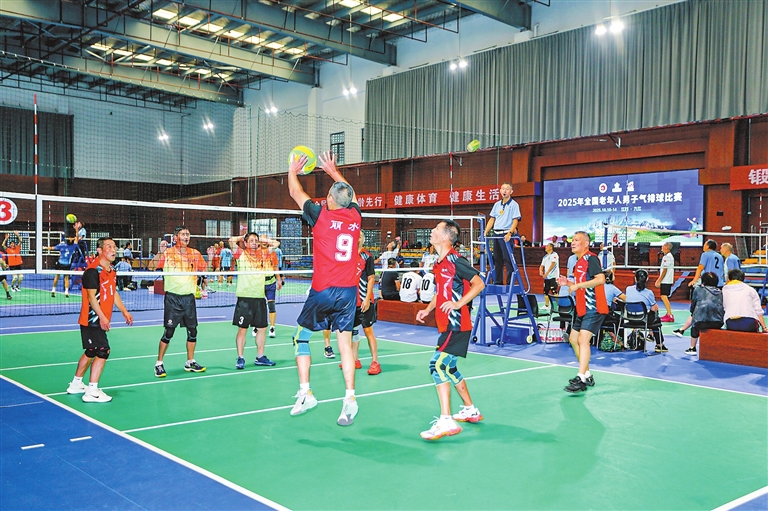 比赛现场,精准的传球、大力的扣杀、鱼跃的扑救、潇洒的拦网、巧妙的吊球……不时引来阵阵掌声,每一个动作都展现着超越年龄的活力。(本报记者 程 鹏 摄)