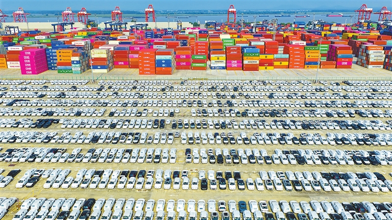 10月4日在江苏省港口集团南京港龙潭港区拍摄的准备装船出口的汽车(无人机照片)。(新华社发 杨素平摄)