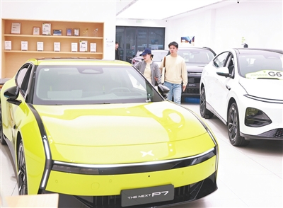 十月十四日,在湖北省武汉市武昌区一家商场,顾客在选购新能源汽车。(新华社发 赵 军 摄)