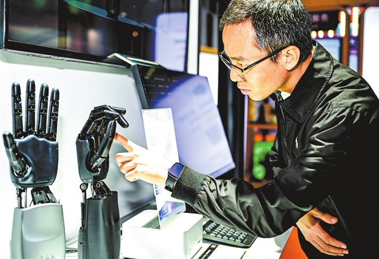 11月6日,在第八届进博会技术装备展区,观众在触摸一款灵巧手。(新华社记者 蔡湘鑫 摄)