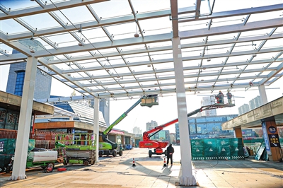 1月6日,九江火车站出站口的风雨连廊正在加紧建设。为进一步加强九江火车站周边车辆有序管理,解决广场两侧通道拥堵、旅客进出站不便等问题,九江火车站实施了上、下广场微改造工程。改造内容主要包括:在出站口建设风雨连廊及配套用房,解决下雨下雪天出行不便等问题;安装抓拍设施,规范车辆通行秩序,保障旅客通行安全与效率;下广场网约车停车场改造并建设上客平台,明确网约车上车点,为旅客出行带来更便捷的体验。