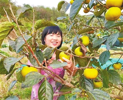 在武宁县官莲乡洪溪村西海情甜柿种植基地里,一棵棵茁壮的甜柿树上,沉甸甸的柿子挂满枝头,引来了一批又一批的外地游客前来采摘。该基地主要种植日本甜柿“阳丰”“太秋”两个品种,面积达1025亩,平均亩产甜柿2000斤,总产量200多万斤,年产值达600多万元。(陈东杨 摄)
