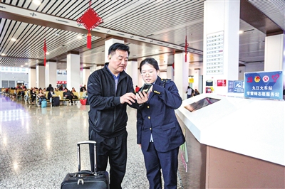 11月5日,在九江火车站,工作人员(右)指导旅客开具铁路电子发票。11月1日起,全国铁路推广全面数字化的客运电子发票服务,旅客在行程结束或支付退票(改签)费用后,可通过铁路12306网站或移动客户端开具电子发票。(本报记者 杨罗军 摄)