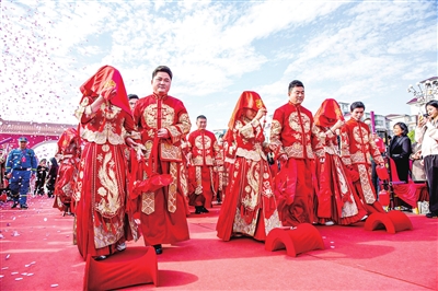 10月30日,2024年都昌县文明实践集体婚礼活动举行,新人在亲朋好友和现场观众的见证下喜结良缘。此次活动旨在弘扬传统文化,倡导文明婚庆新风尚。(特约记者 傅建斌 摄)