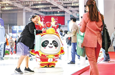 11月22日,参观者在中国旅游集团展台上与龙年主题装扮的冰墩墩玩偶合影。