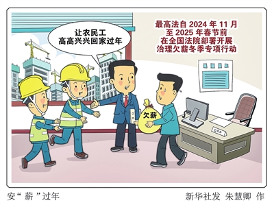 记者12月23日从最高人民法院举行的“强化欠薪治理 保障劳动权益”新闻发布会获悉,最高法自2024年11月至2025年春节前在全国法院部署开展治理欠薪冬季专项行动,切实做好岁末年初欠薪案件审判执行工作,依法及时、有力保障农民工权益,让农民工高高兴兴回家过年。(新华社发 朱慧卿 作)