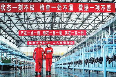 2025年1月1日,大庆油田采油一厂第九作业区工作人员在检查聚合物分压汇管。(新华社发 马 克 摄)