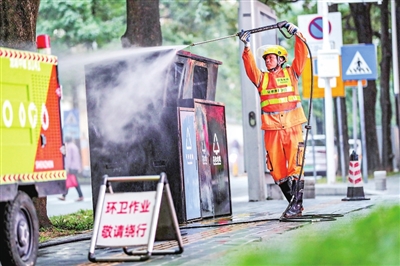 2025年1月1日清晨,环卫工人在深圳市龙岗区一处街区清洁垃圾箱。