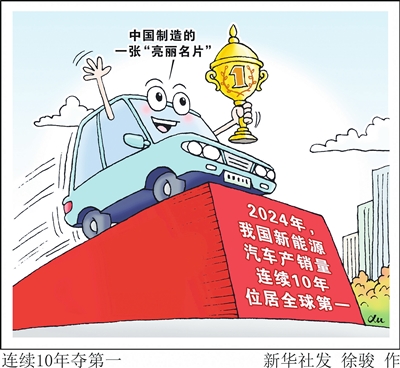 过去10年,我国新能源汽车年产销量从万辆级跨越到千万辆级,产品出口到70多个国家和地区,成为中国制造的一张“亮丽名片”。(新华社发 徐 骏 作)