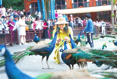 2月19日,游客在西双版纳一景区与孔雀互动。