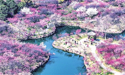 2月24日,游客在江苏扬州瘦西湖风景区“湖上梅林”游玩赏花。 (新华社发 孟德龙 摄)