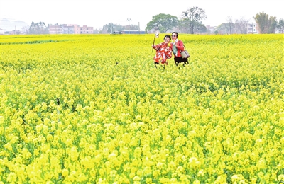 2月24日,游客在广西钟山县公安镇油菜花田赏花拍照。(新华社发 廖祖平 摄)