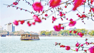 2月24日,一艘船从浙江省嘉兴市南湖风景区湖面驶过,与绽放的梅花相映成景。(新华社发 金 鹏 摄)