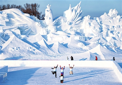 右图:人们在哈尔滨太阳岛雪博会园区内拍照。
