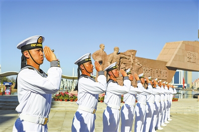 4月23日,在山东青岛的海军英雄广场,海军机关和驻青岛部队举行致敬人民海军英雄仪式,礼兵吹响海军笛,以海军特有礼仪向英雄和先烈们致敬。(新华社发 王远方 摄)