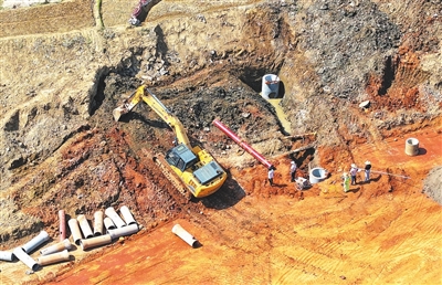 近日,青年路延伸线项目建设现场,道路路基基本成型,工人正在安装地下管网。该项目大致呈东西走向,道路西起盛世名邸路,东止于九莲南路,长约321米。项目建成通车后将进一步完善该区域路网,群众出行将更加便利。(本报记者 刘 家 摄)