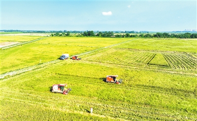 7月14日,共青城市金湖乡五合村,连片的早稻陆续成熟,一台台收割机在金黄的稻田里来回穿梭作业,一派繁忙的丰收景象。连日来,共青城市万亩早稻陆续成熟,当地种粮户冒着酷暑高温、抢抓农时,进行早稻抢收。