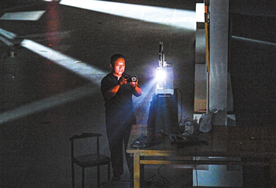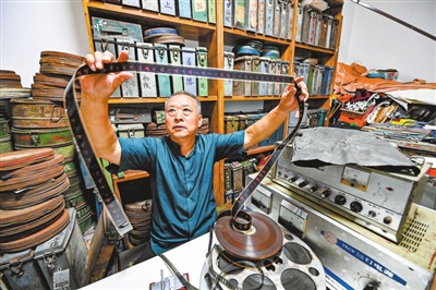 周雪松在位于山西省大同市平城区马家小村的收藏室内检查老电影胶片(8月2日摄)。