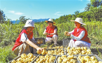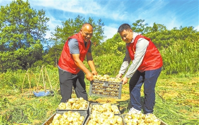 “要顺着球茎生长方向挖,避免损伤鳞茎……”在村集体经济合作社技术人员的现场指导下,青年党员们快速掌握采挖技巧,迅速分工投入“战斗”:有的弯腰刨土,小心翼翼取出饱满的百合;有的蹲身去根,细致清理附着的泥土;有的负责分拣装筐,按标准分类。尽管烈日当空,汗水浸湿了衣衫,但大家干劲十足,热情不减。在党员志愿服务队的助力下,采收效率显著提升。