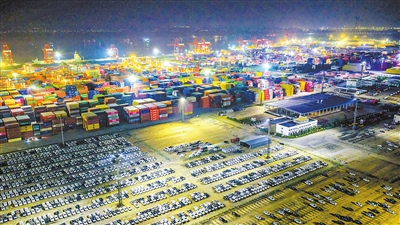 新能源汽车在江苏南京龙潭港集装箱码头等候运输(9月7日摄,无人机照片)。(新华社发 杨素平 摄)