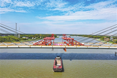 空中俯瞰嘉松公路越江新建工程主桥项目施工现场(9月11日摄,无人机照片)。9月11日,由上海城投建设的嘉松公路越江新建工程主桥主跨钢箱梁顺利合龙,全桥实现结构贯通。嘉松公路越江新建工程位于上海市松江区,是服务松江新城与金山新城的重要跨江通道,主桥桥面全宽36.6米,双向6车道并设置两侧慢行系统。项目建成后,将同时满足机动车、行人和非机动车的过江需求。