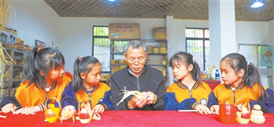 国家级竹编传承人田先敏教小学生竹编技艺。