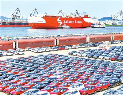 国产汽车在山东港口烟台港集结等待装船出口(9月14日摄,无人机照片)。国家统计局15日发布的数据显示,8月份,全国规模以上工业增加值同比增长5.2%,环比增长0.37%;全国服务业生产指数同比增长5.6%。(新华社发 唐 克 摄)