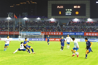9月21日晚,市体育中心体育场再度迎来激情澎湃的足球之夜,赣超淘汰赛首回合,九江队坐镇主场迎战南区劲旅新余队。在30156名球迷的助威声中,九江队凭借6号聂皓天下半场的关键一击,以1∶0小胜对手。这是球员在拼抢中。