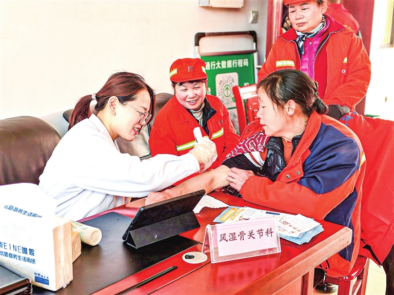 2月21日,九江经开区弘瑞城市运营管理有限公司联合九江市第一人民医院开发区分院开展了“情暖环卫工,义诊送健康”活动,为环卫工人提供全面的健康检查和医疗咨询、用药指导等服务,用实际行动表达对一线环卫工人的关爱。(本报记者 蔡 钦 摄)