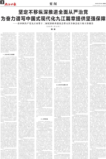 2025年是进一步全面深化改革、推进中国式现代化的起步之年,是全面完成“十四五”规划的收官之年,是《中华人民共和国监察法》修订后的实施之年,是市县乡换届前的关键之年。做好今年工作,要坚持以习近平新时代中国特色社会主义思想为指导,全面贯彻党的二十大和二十届二中、三中全会精神,深入学习贯彻习近平总书记关于党的建设的重要思想、关于党的自我革命的重要思想和考察江西重要讲话精神,认真落实二十届中央纪委四次全会、省委十五届七次全会、省纪委十五届五次全会和市委十二届十四次全会部署,深刻领悟“两个确立”的决定性意义,增强“四个意识”、坚定“四个自信”、做到“两个维护”,坚持用改革精神和严的标准管党治党,坚决落实全面从严治党政治责任,在全市纪检监察系统开展“巩固提升年”活动,纵深推进正风肃纪反腐,持续推进新征程纪检监察工作高质量发展,为奋力谱写中国式现代化九江篇章提供坚强保障。