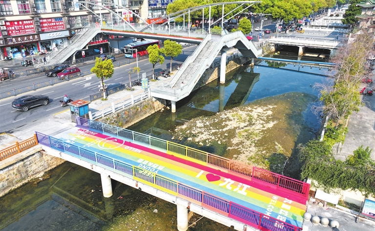 3月26日,濂溪区九里集市(九江学院旁)门前的一座桥梁穿上了“彩衣”,原本灰色的桥身经过彩绘涂装后变得五彩斑斓,亮丽的色彩和图案装扮让这座普通的桥梁变成了美丽又显眼的“彩虹桥”。(本报记者 刘 家 摄)
