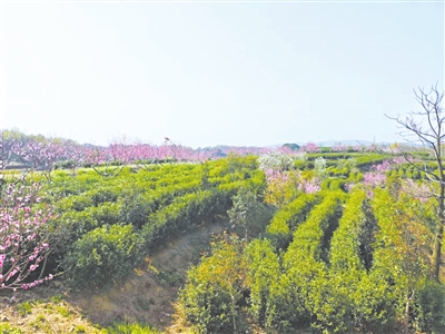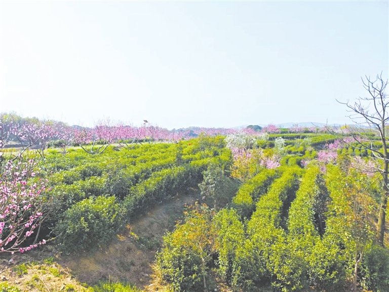 基地种植的蟠桃和中华血桃花繁叶茂,桃树下套种的茶树也早已冒出了嫩绿的芽尖。自2018年以来,该村利用流转的闲置260亩土地发展茶产业。由于当地良好的生态环境,生产的茶叶品质优良。“当前正是明前茶的生产旺季,茶园每天聘用 30名村民帮助采摘。”该村党支部书记付江平介绍。
