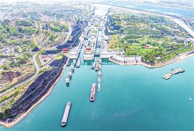 3月29日,在湖北宜昌,船舶有序通过三峡双线五级船闸(无人机照片)。