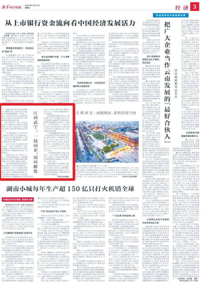 4月2日,中央级主流媒体《新华每日电讯》聚焦江西武宁,单条报道该县持续优化营商环境,坚持一线问企,闭环解忧,既打好破除壁垒的攻坚战,又久久为功推进制度创新,让经营主体发展活力持续迸发的好经验、好做法。