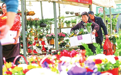 4月3日,长虹东大道旁的花卉市场,购买鲜花祭祀的市民络绎不绝。近年来,随着文明祭祀宣传的不断深入,越来越多的市民使用鲜花或手工环保花等祭祀缅怀先人。这种绿色、文明的祭扫方式,让传统清明文化焕发出新的时代内涵。(本报记者 欧阳海员 摄)