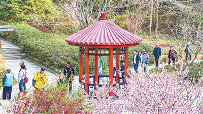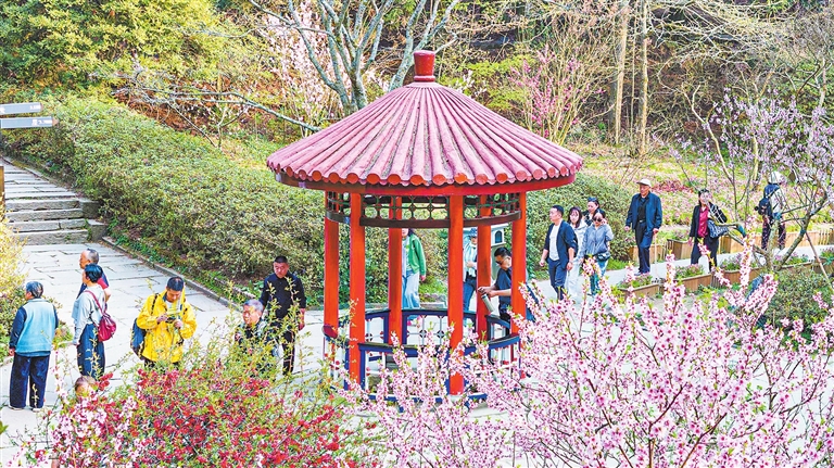 近日,庐山花径公园内桃花盛开,众多游客跟着唐诗来此寻觅春光。因海拔较高,庐山春季较周边来得更晚,诗人白居易在此写下“人间四月芳菲尽,山寺桃花始盛开”的千古诗句,这里也被后人称为“白司马花径”。