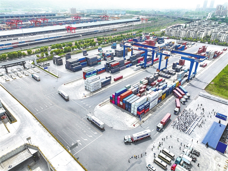 4月14日,氢能重卡在陆海新通道重庆无水港顺利发车(无人机照片)。