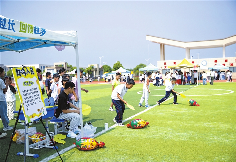5月26日,在“六一”国际儿童节到来之际,共青城市实验小学开展了一场主题为“多彩童年 童心飞扬”的六一游园活动,让孩子们在欢声笑语中感受节日的快乐,收获友谊与成长。此次活动精心设置了近30个小项目,九宫格飞盘、袋鼠跳跳、趣味保龄球、足下生威等游戏,不仅充满趣味性,更蕴含着深刻的教育意义,学生们每成功体验一个项目,就能获得相应奖品,活动现场热闹非凡。(潘 成 本报记者 刘 家 摄)