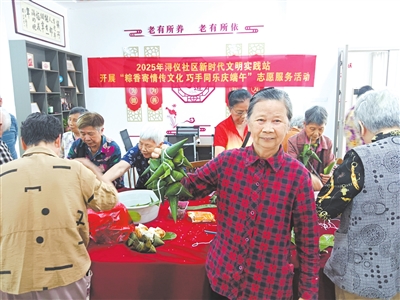 彩缕碧筠粽,香粳白玉团。提前准备好的糯米、粽叶、三层肉、蜜枣等原材料整齐地摆放桌上,洗好的粽叶幽香阵阵,浸泡好的糯米粒粒晶莹。活动现场,志愿者带领社区居民一起了解端午节的由来与习俗,传承历史文化。浔仪社区的包粽高手们齐聚一堂,她们纷纷拿出绝活,或折叶或填米或扎绳,动作一气呵成,一个个棱角分明、饱满紧实的粽子在他们手中成型。年轻人围在一旁,眼中满是好奇与钦佩,纷纷向长辈们请教包粽技巧。“闺女,粽叶这样叠,把米放进去,包起来再扎好,才能包得严实。”一位奶奶耐心地指导着身旁的年轻人。