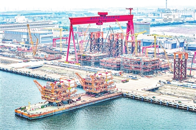 这是6月1日在天津滨海新区拍摄的垦利10-2油田开发项目(一期)平台装船作业现场(无人机照片)。当日,垦利10-2油田开发项目(一期)最后一个平台组块在天津装船,将赴渤海南部海域进入海上安装和联调阶段。这标志着该项目3座海上平台陆地建造工作全面收官。垦利10-2油田开发项目(一期)主要生产设施为1座中心平台和2座无人井口平台,均为新建,还包括新铺的7条海底管道和4条海底电缆等。油田位于渤海南部海域,距离天津市约245公里,是中国海油2021年在莱州湾凹陷浅层发现的大型岩性油气藏,原油探明地质储量超过1亿吨。(新华社发 杜鹏辉 摄)